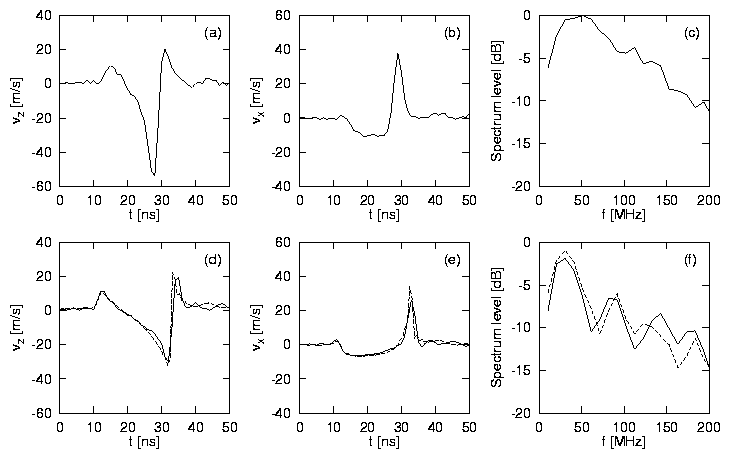 Figures 1(a)-(c) show the measured waveforms and peak-normalized spectrum at distance x = 5 mm from the excitation region. Propagation of the surface wave was in the á112ñ direction of the (111) plane, and because of symmetry vy = 0. Linear theory was used to compute the horizontal velocity vx [1(b)] from the measured vertical velocity vz [1(a)]. The measurement at x = 5 mm was used as the starting condition for the computations, and the resulting predictions for the waveforms and spectra at x = 21 mm are shown as dashed lines in Figs. 1(d)-(f). The solid lines again correspond to the measurements. No curve fitting was employed-all material constants used in the calculations were taken directly from measurements reported in the literature [6]. The nonlinear waveform distortion is predicted accurately by the theory, including the increase in pulse duration (note that the spectral peak shifts from 50 MHz down to about 30 MHz). There are notable differences with the Rayleigh wave measurements reported earlier [3-5]. In the present experiment, the vertical component vz evolves into an N-shaped waveform and the horizontal component vx evolves into one that is U-shaped, whereas the reverse was observed in isotropic solids.